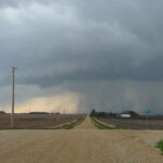 I observed one more cone tornado after the stovepipe dissipated. I went through Arthur, and kept east on 175. Between lightning flashes I observed an elephant trunk shaped tornado, followed by a wedge.